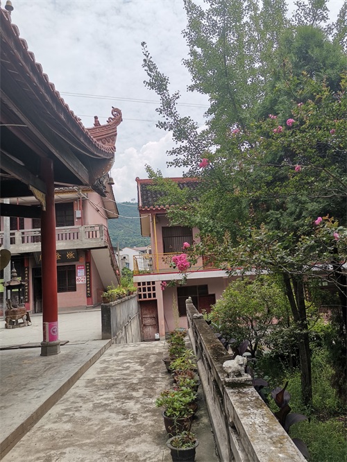 街头巷尾到处种植果树,也是一大特色。听说镇上有个千年的古庙,叫金山寺,我决定上山一拜。沿着一条七拐八绕的小巷,向山上走去。路两边是一户户人家,每家每户的门前屋后,包括路边的空地上也长满了果树,有的甚至就生长在排水沟的边上,沟里从陡坡流下湍急的泉水,一路向下哗哗奔流,有果子从树上掉下,立刻被激流冲走。