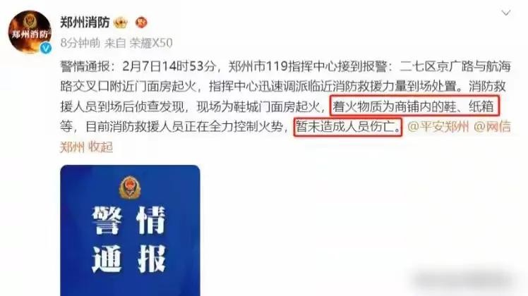 随后郑州消防发布警情通报:他们接到报警后迅速组织救援力量到场,侦查后发现是门面房起火,着火物质为鞋和纸箱。