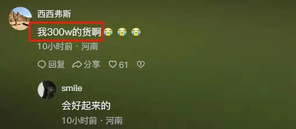 评论区一个比一个惨,另一个商户哭诉:我300万的货啊,就这样眼睁睁看着它没了,一点办法没有。