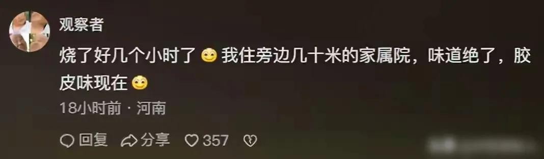 大火烧了几个小时,空气中弥漫的都是塑料胶皮味道,几十米外的住户都能闻到。