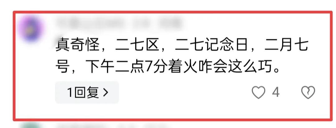 着火的区是二七区,着火日期是2月7日,这当然不能说明什么,就是一看到巧合就会让人浮想联翩。