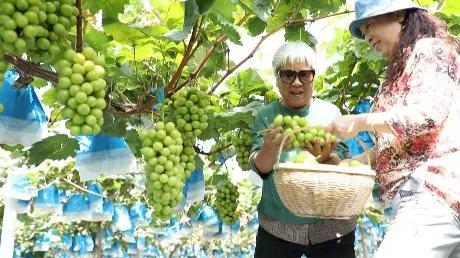 马龙告诉记者,“阳光玫瑰价格高,主要销往南方城市。看这一棵树上结了二十多串,能卖1000多块钱。这园子里有5000多棵树,几十万的效益还是有的。”