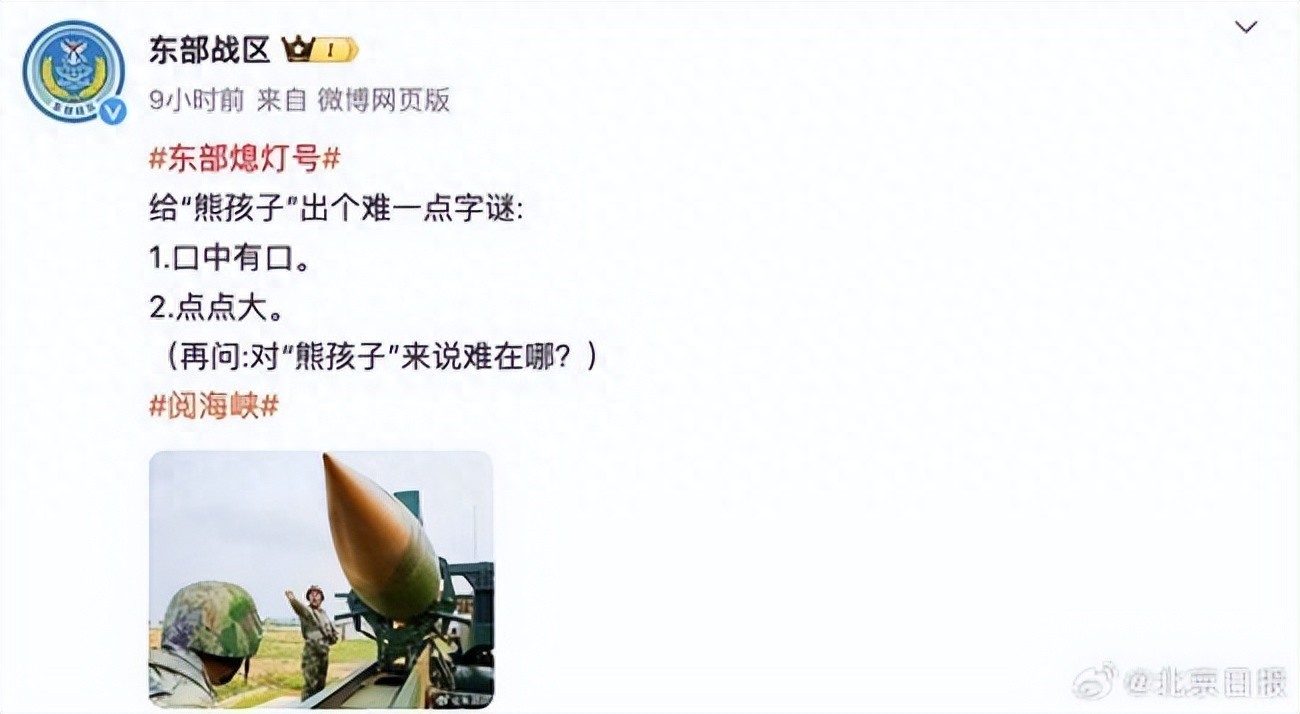 近日,东部战区在睡前给“熊孩子”出了一道字谜:口中有口,点点大。这道字谜一出,立即引发了网友的热议。