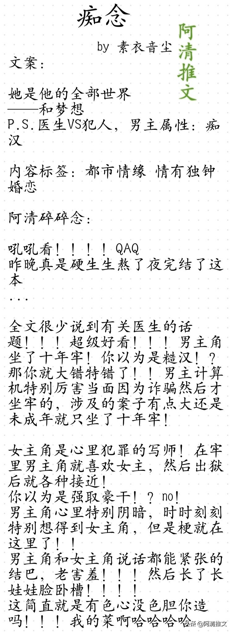 1.《痴念》这本别看文案少,但是真的好好看,作者文笔不错,很吸引人看下去的。必须熬夜看完系列。