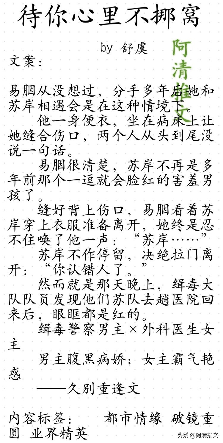 2.《待你心里不挪窝》这本也好看!男主腹黑病娇,女主霸气艳惑太好看了!作者大大文笔好,从头开始男主就在设局,真牛逼。