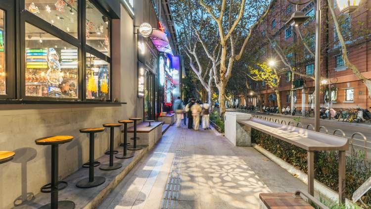 在巨鹿路“美丽街区”二期改造中,JULU758门口原本单一的绿化带被赋予多样化活动功能,坐凳、吧台与绿化景观巧妙融合,打破边界,与创意街区色彩基调相得益彰,为巨鹿路注入了全新活力。