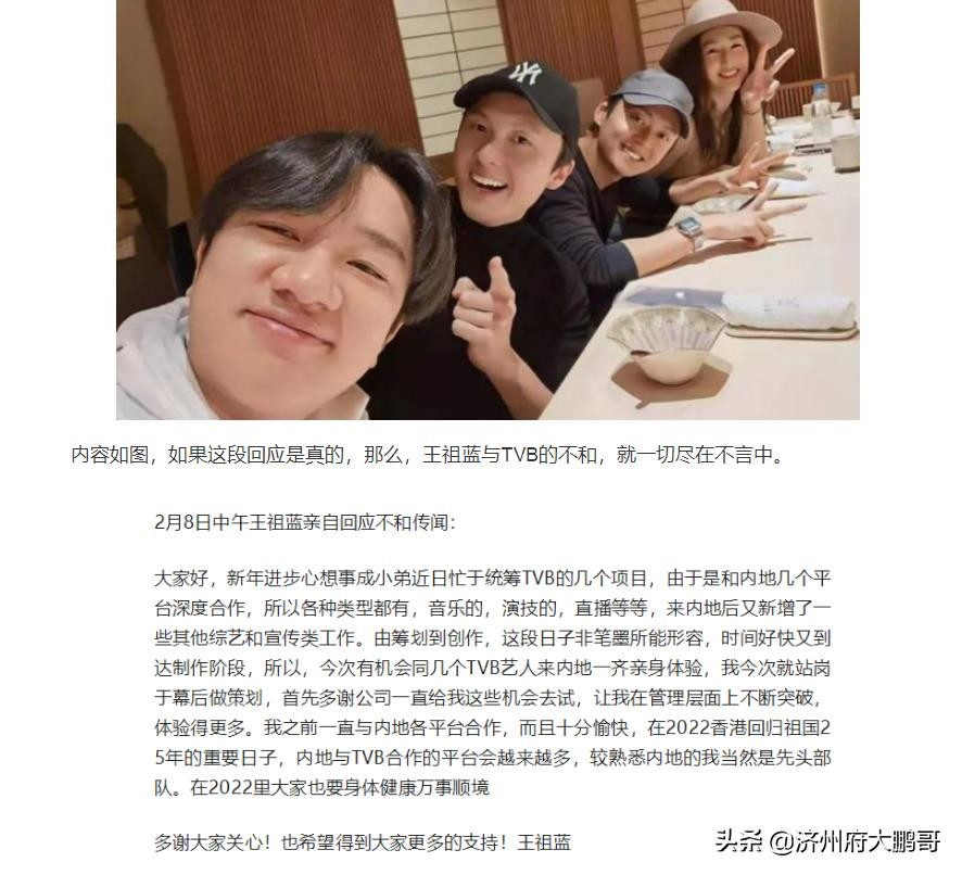 两个月之前的2月8号,王祖蓝回应与TVB不和,早就为了今天的辞职,埋下了伏笔。