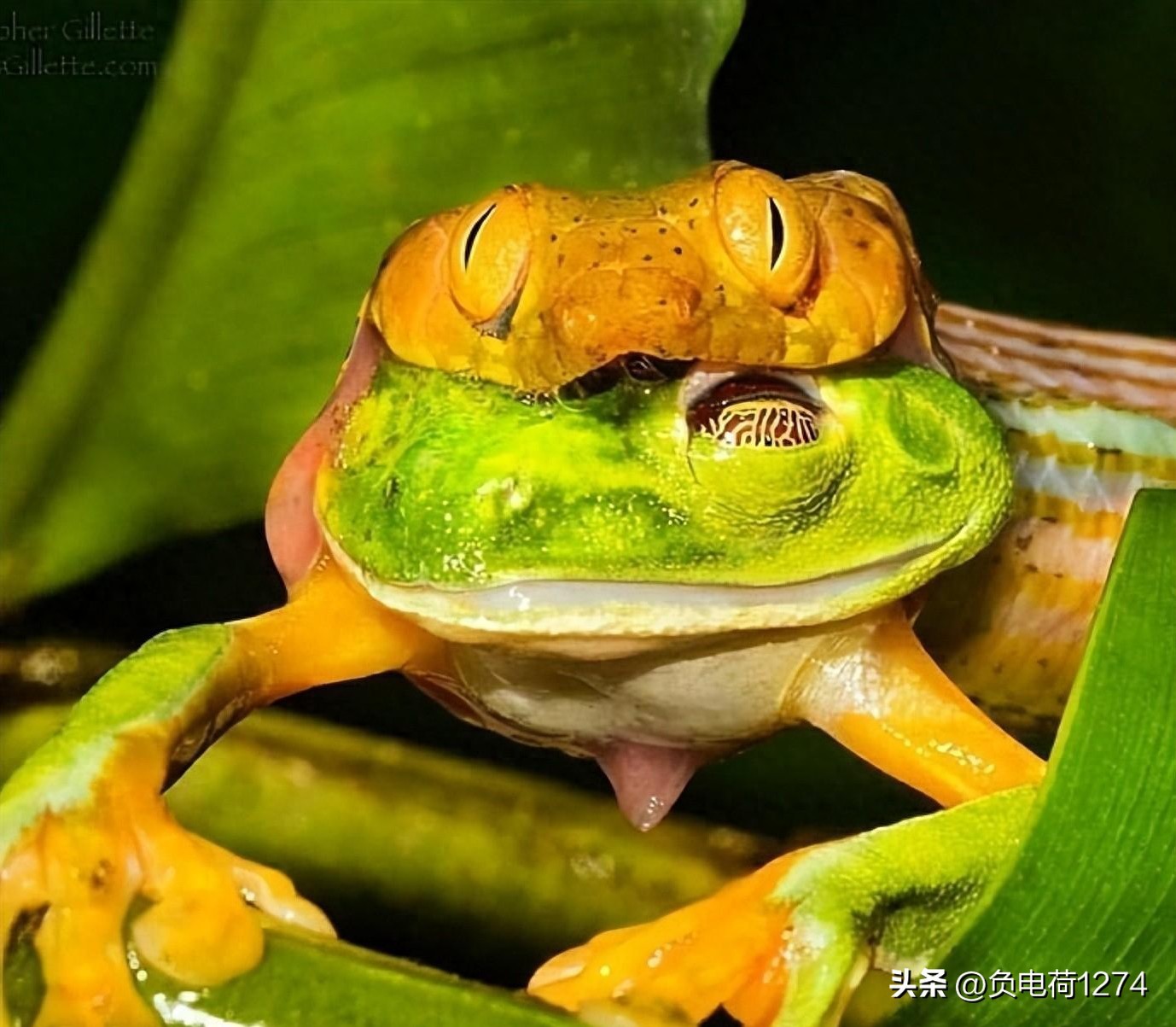 15、尽管蟾蜍用尽力气把自己的身体鼓成了球,但是仍免不了被蛇吞掉的命运。