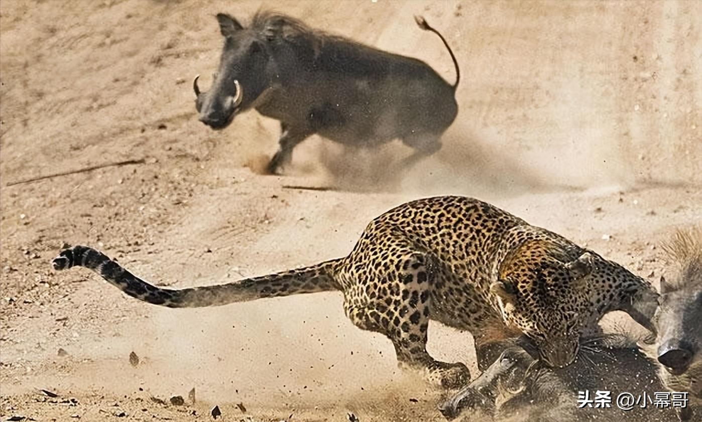 16、一只花豹正要对一只小疣猪发动攻击,护子心切的疣猪妈妈奋不顾身地冲了过来,强行撞飞了花豹,救走了自己的孩子。
