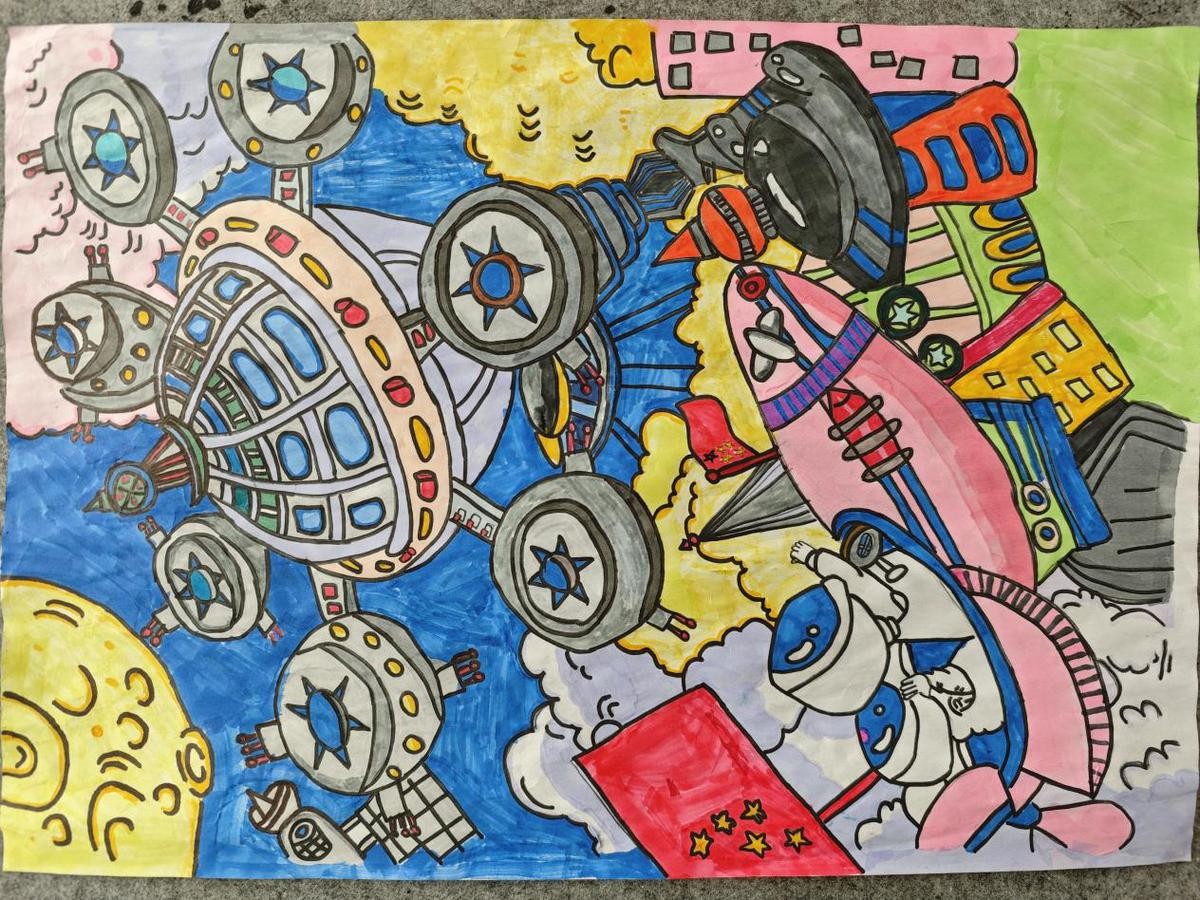(“科技带来美好生活”主题科普绘画征集活动获奖的学生画作《悬浮空间》)