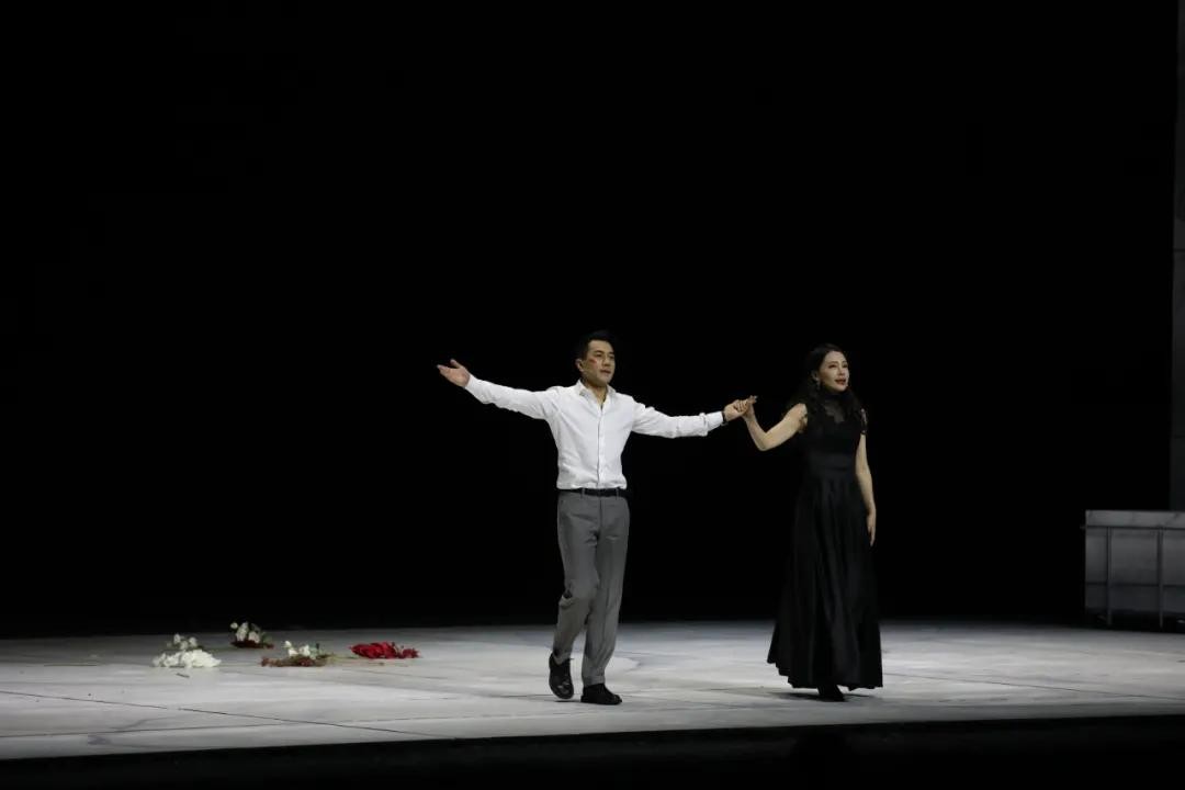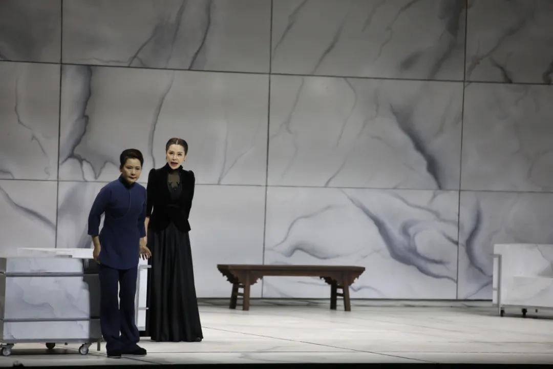 比如,过于现代化风格的服化道设计充斥着一种现代都市剧之感,而通体纯白的大理石墙作为周公馆内景,使得原著中紧闭着窗子而总是闷热、冒着鬼气的屋子一扫它原本阴森森的氛围,在舞台灯光的照射下显得过于明亮,俨然没有那困住繁漪十八年的封建家庭该有的窒息与可怖。再比如,当演员在舞台上表现着人物剧烈的挣扎和痛苦时,混着摇滚风格的伴奏突然响起,实在有些不合时宜。观众不禁想知道,自己究竟是在话剧《雷雨》的现场,还是在某个夜晚,纵情声色于酒吧抑或舞厅。这也是场没有雷声不见雨夜的《雷雨》,全场唯一的雷声是在鲁侍萍逼迫四凤答应自己不再和周家人来往时响起,而被雷雨交杂着被掩盖了的枪声也变成了震耳欲聋,夺走了本应该出现的雷声轰鸣。