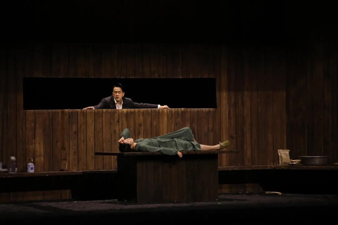 对鲁家的出场,倒没有使用周公馆那样从天而降的方式,而是采取了类似影视拍摄中的推镜头,埃里克导演将鲁家设计成一间朴素的木屋,从舞台的最后方一点点地向前推动,随着木屋朝前推近,屋里僵持着的一家人也开始了争吵。依然是极简的风格,昏黄的灯光被塞在木屋中,却营造出一种逼仄、破败的感觉。