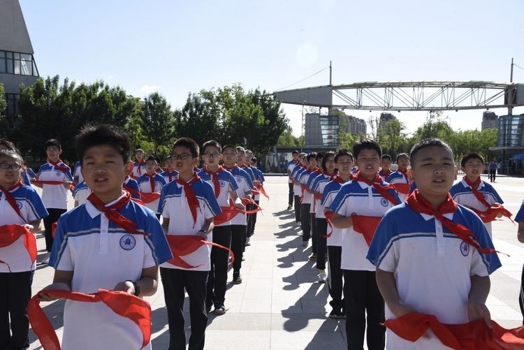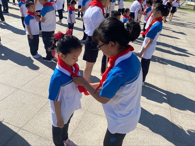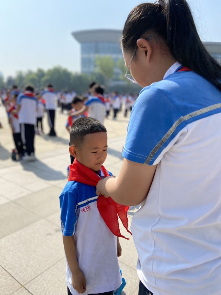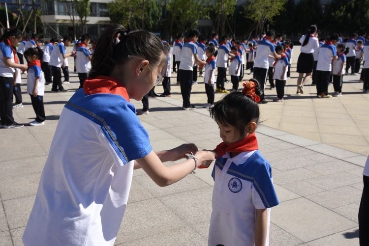 然后,五、六年级的少先队员为新队员们戴上了他们期盼已久的红领巾。承载着责任与希望红领巾飘扬在了新队员们的胸前,脸上的喜悦和眼中的坚毅表明了他们将为共产主义事业而奋斗的决心和渴望。