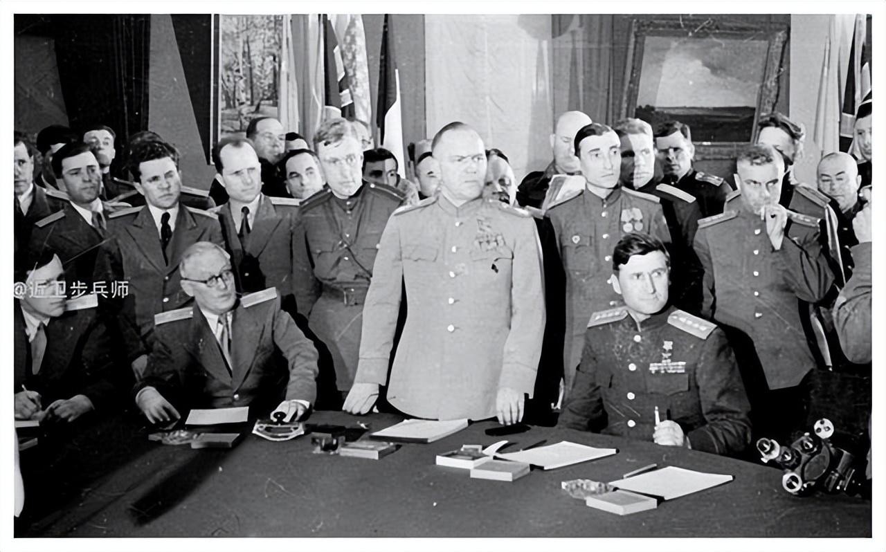 接受德国无条件投降时,站着的朱可夫左手边坐着的就是索科洛夫斯基