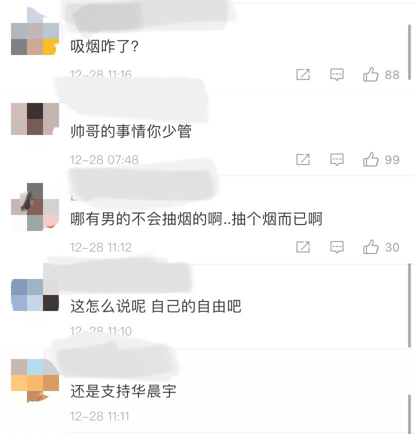 华晨宇室内吸烟这件事曝光后,很快遭到网友指责其抽烟不分场合、素质低下,但面对网友的批评,他的粉丝们却不以为然,依然坚定支持华晨宇的行为,认为这是个人自由,媒体不应干涉;有的粉丝认为华晨宇已经30岁,这个年龄的男星抽烟很正常,没什么好指责的;甚至有粉丝直接呛声媒体:抽烟咋了?关你啥事?