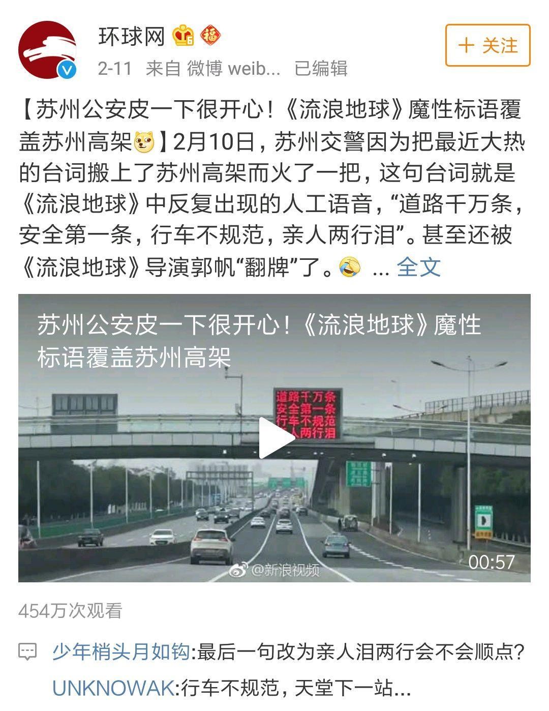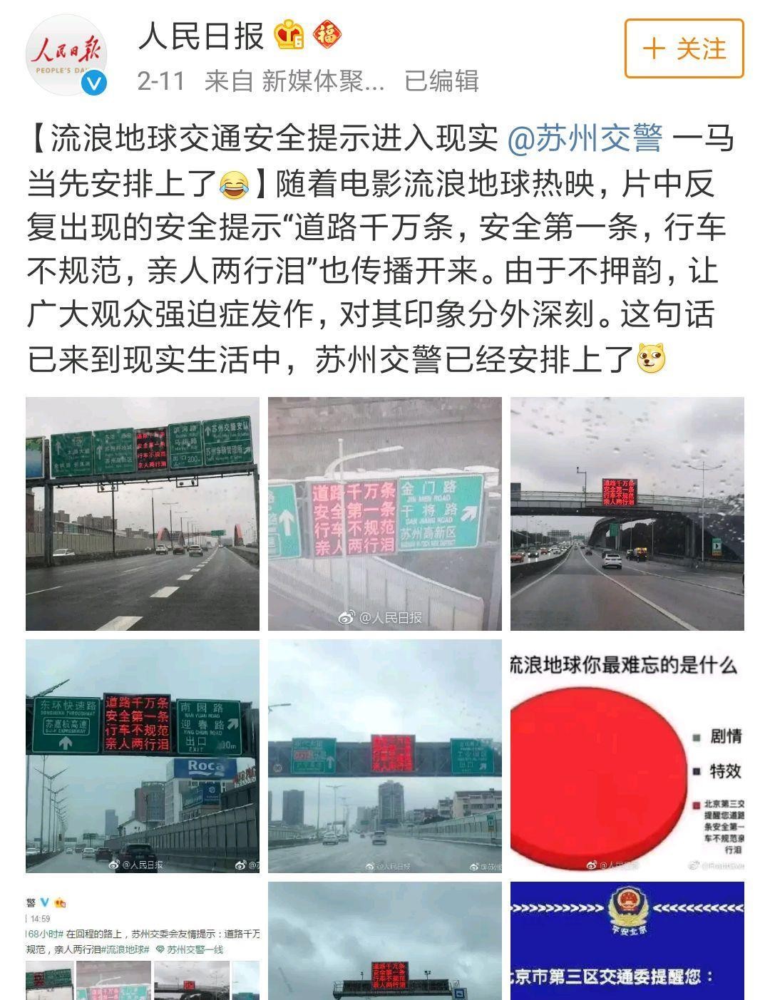 上映十多天来,《流浪地球》的票房大卖,口碑也极速飙升,连带着这句交通安全宣传语也火遍全国。寒假期间,正是交通繁忙的时候,人们或是踏上了回家的路,苏州、杭州、深圳、潍坊等多地交管部门齐刷刷地把它原样照搬到当地交通信息显示屏上,评论说,这20个字,堪称史上最硬核的道路安全提醒。