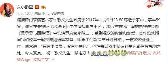 六小龄童发文悼念,他曾在央视版《水浒传》中饰演矮脚虎王英,2007年在我主演的电视连续剧《吴承恩与西游记》中饰演罗府管家贼二 ,受到观众的称赞和喜爱,合作拍戏期间我们经常一起交流沟通聊家常,印象中他就没离开过剧组,一直兢兢业业工作,他常说:“只有小演员,没有小角色”。 祝许敬义先生一路走好!