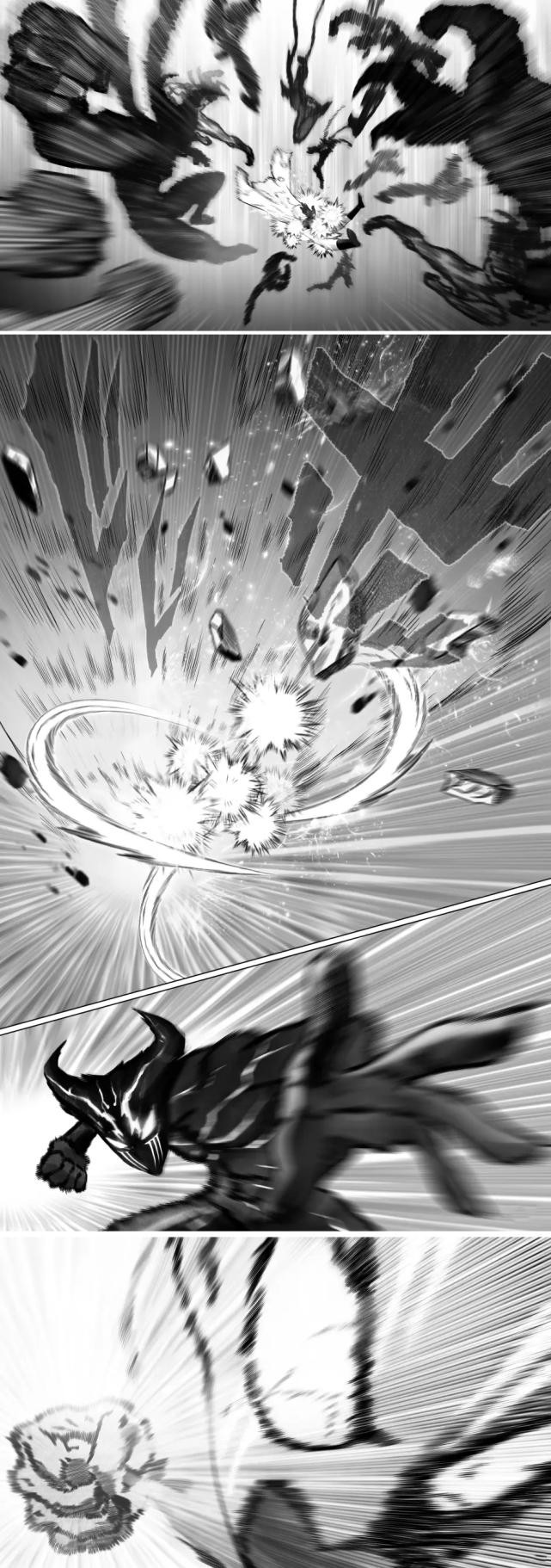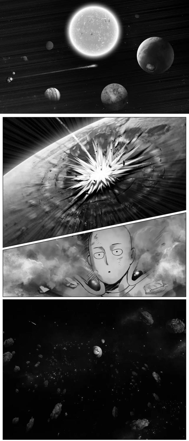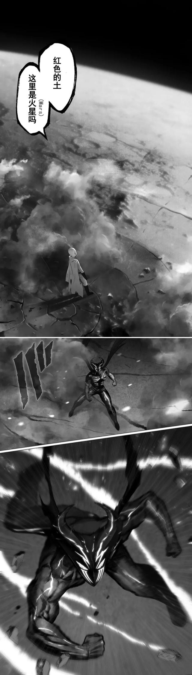 饿狼不敢相信,也不甘心就这样输掉,接着又使出一个大招“神杀重击”,对着埼玉的肩膀打下去,只见刚才被埼玉掀起来的那块地表四分五裂,饿狼继续不停地猛攻,把埼玉都打到火星上去了。