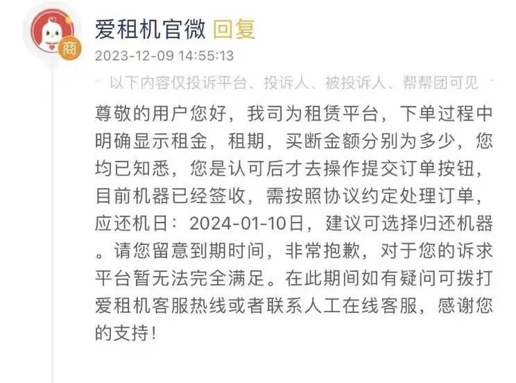 日前,平台客服拒绝了张先生的诉求,答复称“下单过程中明确显示租金、租期、买断金额分别为多少,您均已知悉,是认可后采取操作提交订单按钮……建议可选择归还机器。”