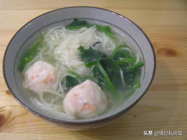5、将虾球、肉馅球、西红柿块、姜片一起放入沸水中煮熟,再加少量盐调味。 6、将汤和菜料放入面碗中即可。