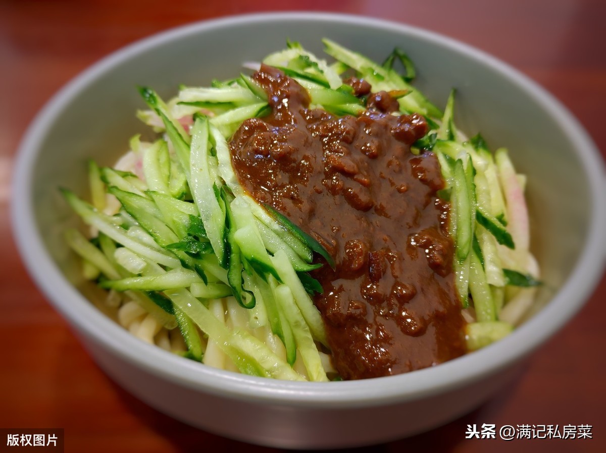 材料:半肥瘦肉末500克、黄酱1袋、清水150毫升、京葱1根、老抽1勺、绿豆芽200克、黄瓜1根、面条适量、大蒜适量、醋适量