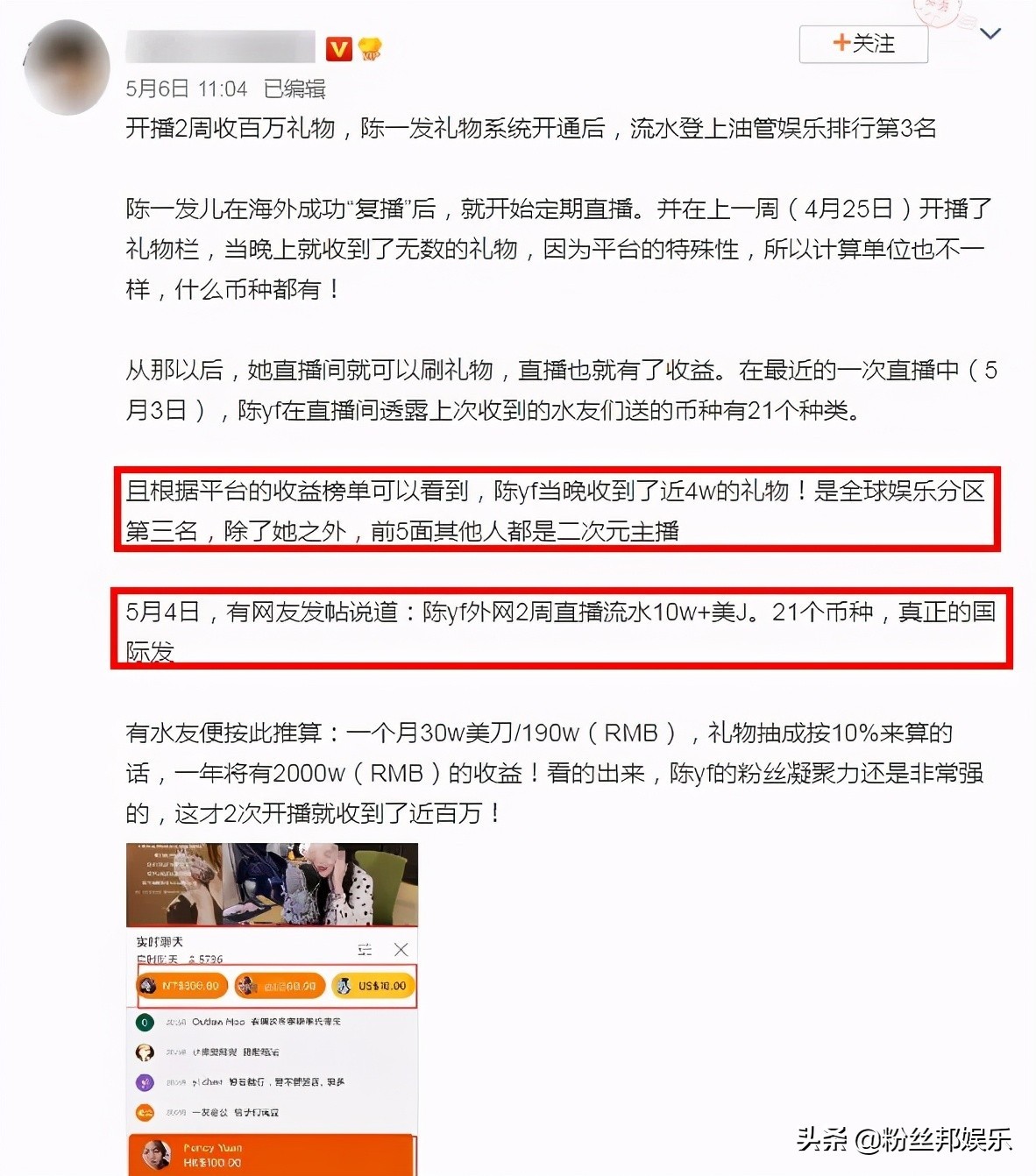 而近日陈一发再次直播后,有网友统计出了她的直播收入情况。