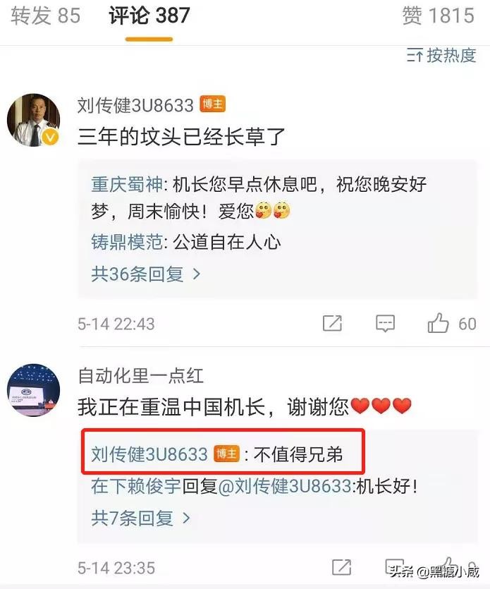 很多人都在问这是啥情况?表示没看懂机长意思。不久以后,刘机长又回复了一个网友留言:不值得兄弟。