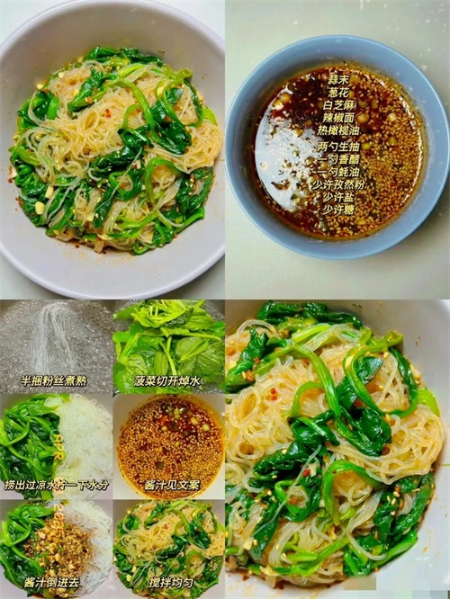 配料:粉丝、菠菜、蒜末、葱花、白芝麻、辣椒面、生抽蚝油、陈醋、盐、白糖、孜然粉、油(橄榄油)