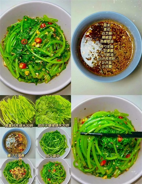 配料:茼蒿、蒜末、葱花、白芝麻、辣椒面、小米辣、生抽、蚝油、香醋、盐、白糖、孜然粉、油(橄榄油)