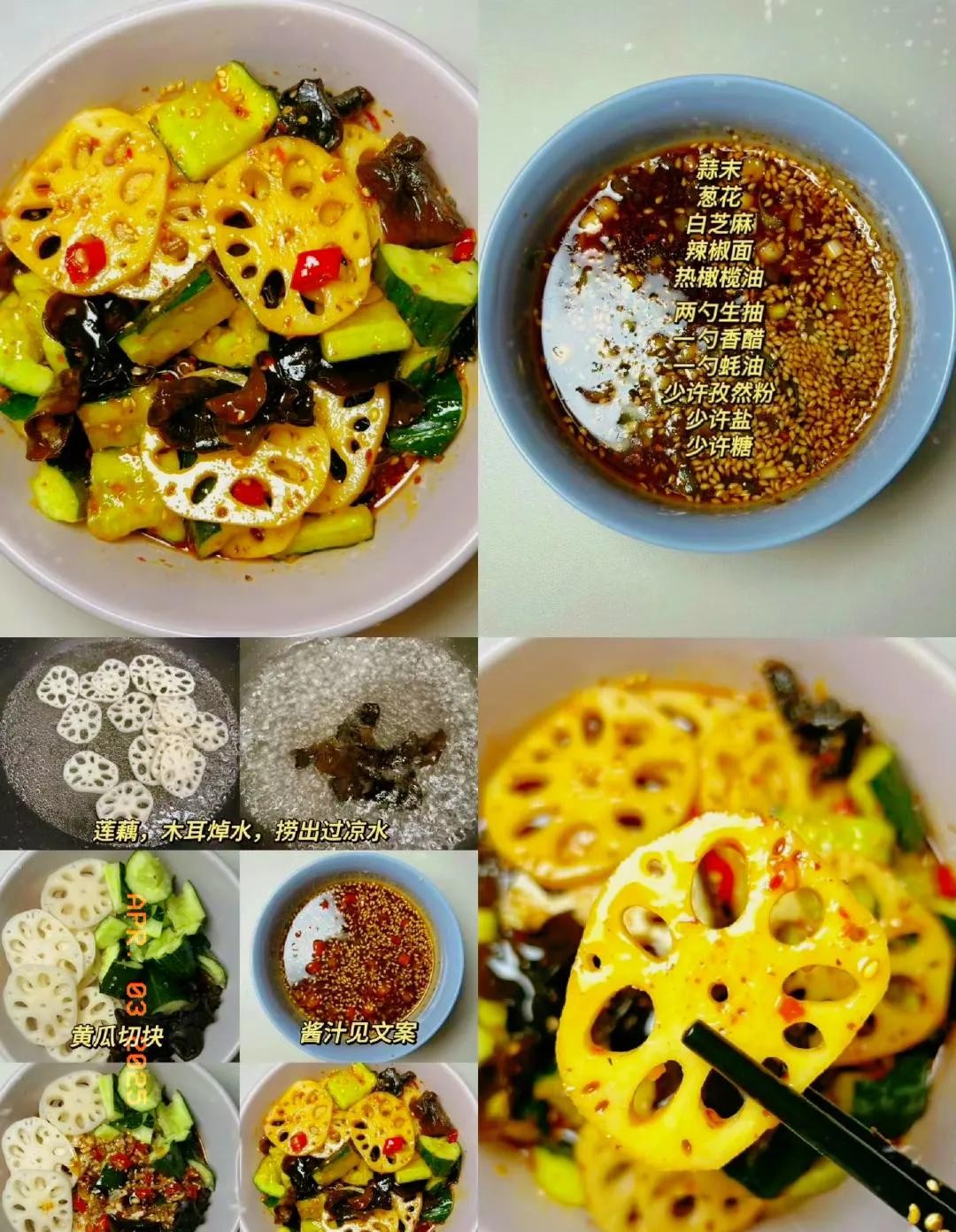 配料:藕、木耳、黄瓜、小米辣、蒜末、葱花、白芝麻、辣椒面、生抽蚝油、陈醋、盐、白糖、孜然粉、油(橄榄油)