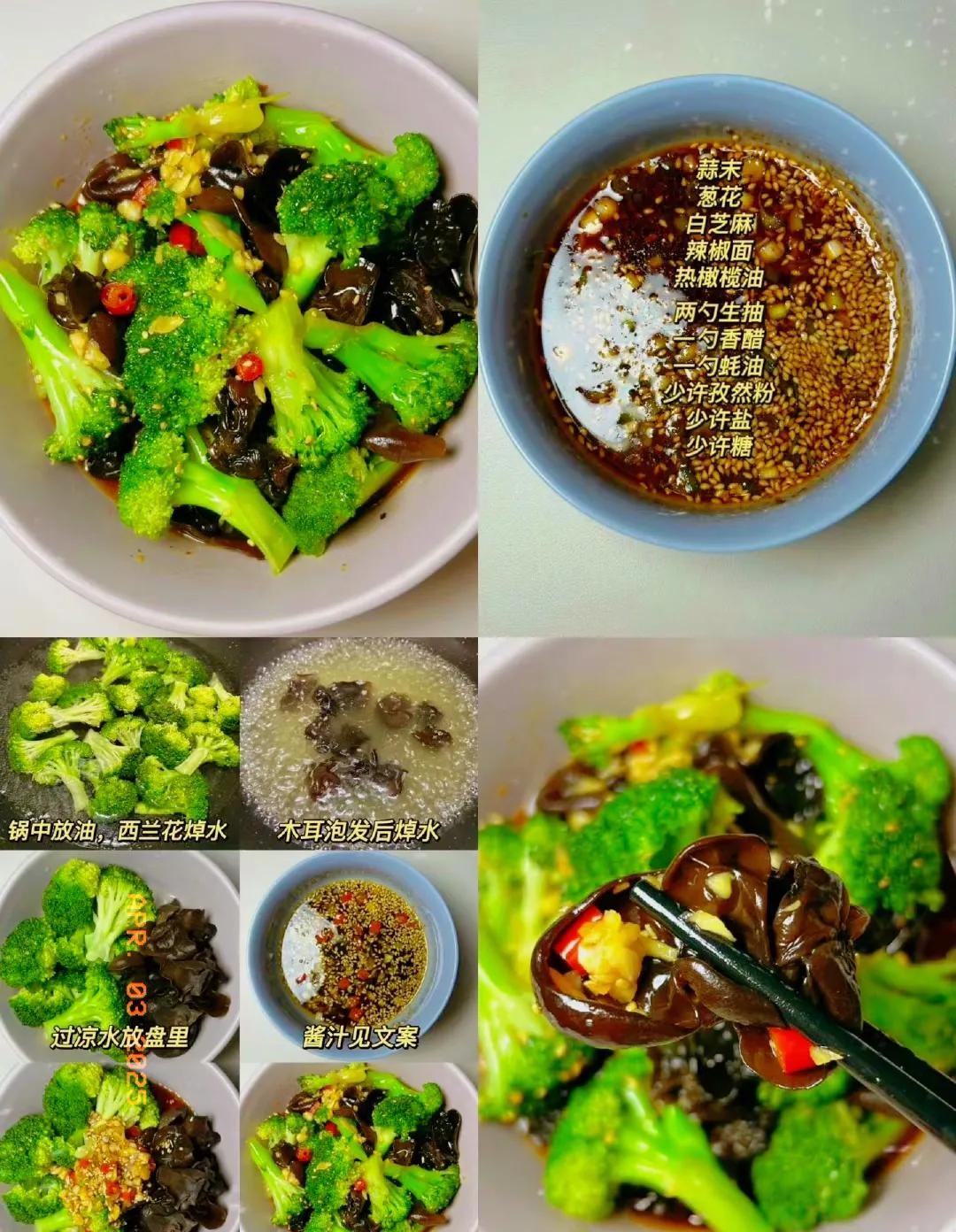 配料:西兰花、木耳小米辣、、蒜末、葱花、白芝麻、辣椒面、生抽蚝油、陈醋、盐、白糖、孜然粉、油(橄榄油)