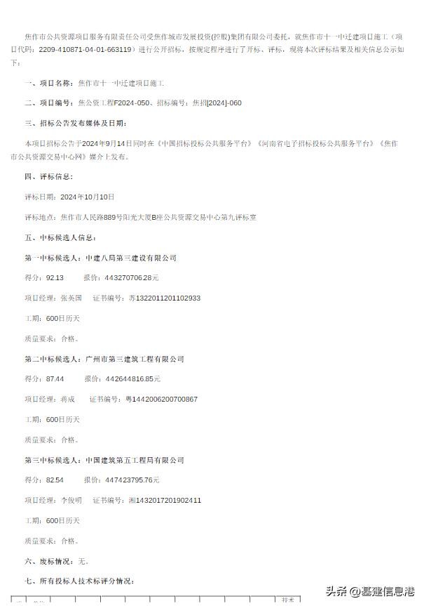 焦作市十一中迁建项目施工中标候选人公示,总投资约8.35亿元