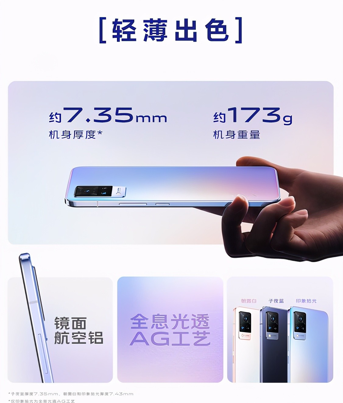 作为vivo现阶段最轻薄的5G手机,工程师将vivo S9的内部堆叠结构进行了全方位优化,厚度不仅压缩到了7.35mm,整机重量更是控制在了173g,这不仅对于vivo来说是一项非常大的挑战,甚至在5G手机市场中,如此轻薄的机身也实属罕见。而在全新的印象拾光、子夜蓝、朝露白三款配色的加持下,还进一步凸显出了vivo S9的艺术美感。