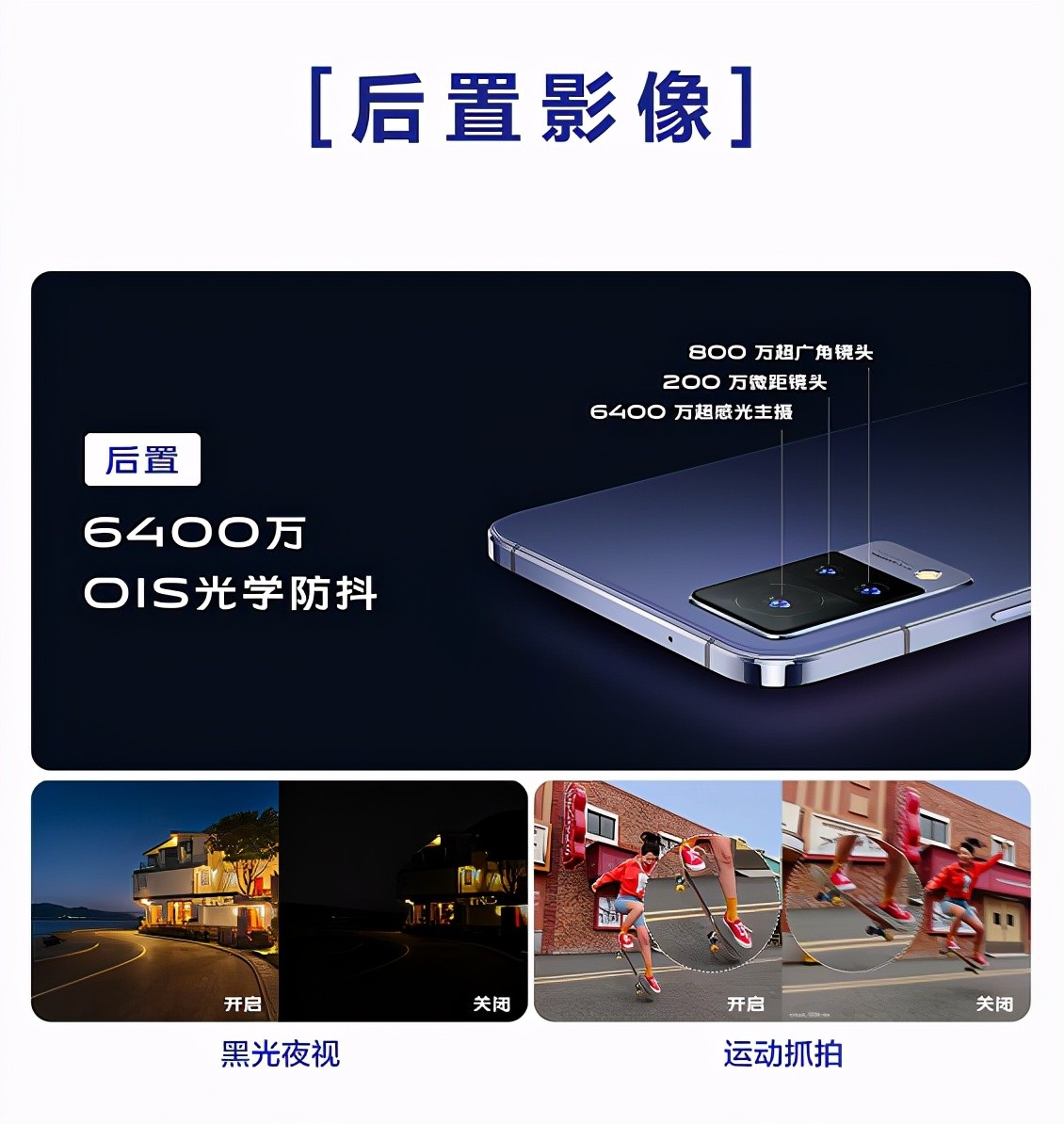 针对年轻人愈发全面的拍摄需求,vivo S9在后置影像系统上也进行了非常大的提升。从这张图中我们可以了解到,vivo S9后置影像模组采用了6400万像素OIS黑光夜视三摄方案,分别为一颗6400万像素主摄、一颗超广角镜头与一颗微距镜头,以保证带来多场景级别的拍摄体验。同时,该机还加入了OIS光学防抖技术与vivo自研的独家黑光夜视算法,拍摄更加稳定,夜景大片更能唾手可得。