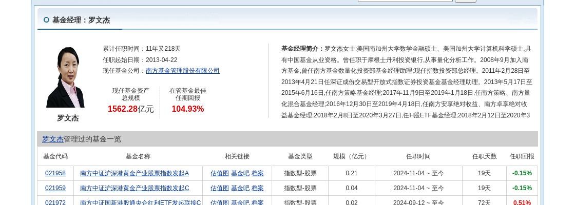 简历显示,罗文杰女士:美国南加州大学数学金融硕士、美国加州大学计算机科学硕士,具有中国基金从业资格。曾任职于摩根士丹利投资银行,从事量化分析工作。2008年9月加入南方基金,曾任南方基金数量化投资部基金经理助理;现任指数投资部总经理。2011年2月28日至2013年4月21日任深证成份交易型开放式指数证券投资基金基金经理助理。2013年5月17日至2015年6月16日,任南方策略基金经理;2017年11月9日至2019年1月18日,任南方策略、南方量化混合基金经理;2016年12月30日至2019年4月18日,任南方安享绝对收益、南方卓享绝对收益基金经理;2018年2月8日至2020年3月27日,任H股ETF基金经理;2018年2月12日至2020年3月27日,任南方H股联接基金经理;2014年10月30日至2020年12月23日,任500医药基金经理;2021年3月12日至2023年2月24日,任南方中证创新药产业ETF基金经理;2021年10月22日至2023年2月24日,任南方中证全指医疗保健ETF基金经理;2020年12月25日至2023年8月25日,任南方策略基金经理;2021年7月2日至2023年8月25日,任南方中证香港科技ETF(QDII)基金经理;2022年6月17日至2023年8月25日,任南方恒生香港上市生物科技ETF(QDII)基金经理;2023年5月30日至2024年7月5日,任南方恒生香港上市生物科技ETF发起联接(QDII)基金经理;2013年4月22日至今,任南方500、南方500ETF基金经理;2013年5月17日至今,任南方300、南方300联接基金经理;2015年2月16日至今,任南方恒生ETF基金经理;2017年7月21日至今,任恒生联接基金经理;2017年8月24日至今,任南方房地产联接基金经理;2017年8月25日至今,任南方房地产ETF基金经理;2018年4月3日至今,任MSCI基金基金经理;2018年6月8日至今,任MSCI联接基金经理;2020年7月24日至今,兼任投资经理;2024年6月26日至今,任南方中证国新港股通央企红利ETF基金经理;2024年7月5日至今,任南方基金南方东英沙特阿拉伯ETF(QDII)基金经理。2024年9月12日至今,任南方中证国新港股通央企红利ETF发起联接基金经理。