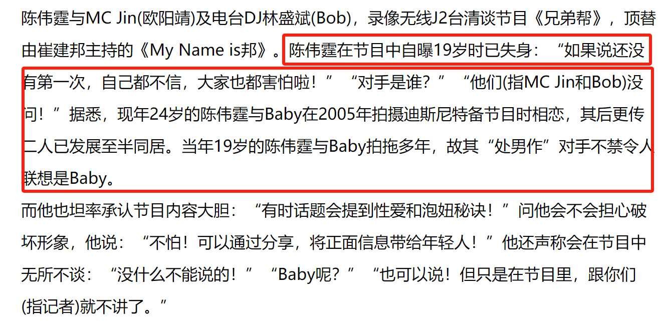主体:首先我们要提的是陈家兄弟姐妹众多。陈伟霆早期在演艺圈崭露头角时,曝出他在19岁那年失守了人生花蕾。之后有人发现,陈和baby曾是甜蜜柠檬情侣,当时两人的荤段子短信在圈内疯传。