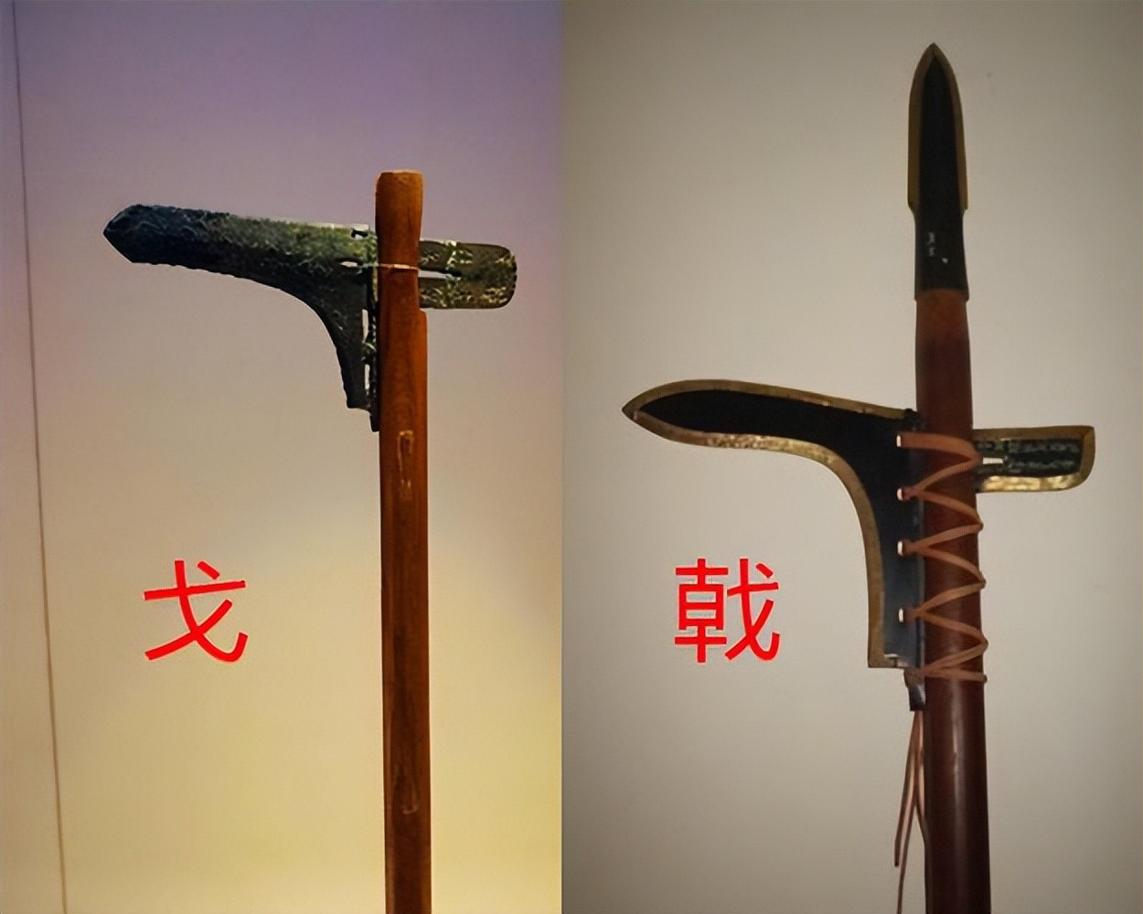 戈是一种曲头兵器,横刃,用青铜或铁制成,装有长柄,以钩、啄、挥、推为主。