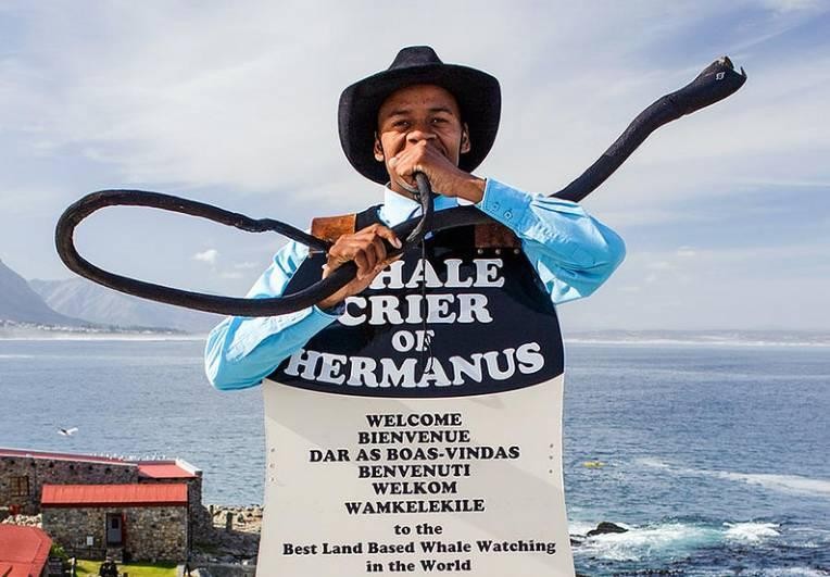 南非有一种职业叫报鲸人。位于南非的赫曼努斯是世界上最好的鲸鱼陆地观察场所。每年5月到11月就会有数千头鲸鱼来到这里繁衍生殖。这吸引了很多游客前来观赏,于是就有了“报鲸人”这种职业。报鲸人的工作就是当鲸群靠近海岸时吹响号角告诉大家鲸群出没的消息。