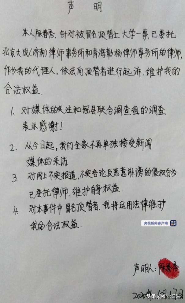 9.山东被冒名上大学农家女委托律师起诉顶替者:近日,山东冠县农家女陈某秀被冒名顶替上大学一事引发关注。17日,陈某秀称已聘请律师,将起诉顶替者陈某某。此前,涉事山东理工大学曾调查该事件,顶替者陈某某及家人承认冒名顶替他人上学的事实,并称相关入学材料系找中介代办。目前,相关事项正在调查。(南方都市报)