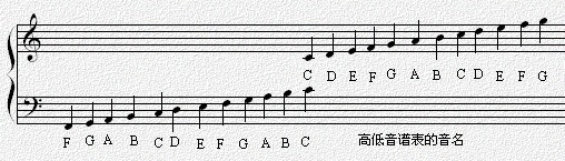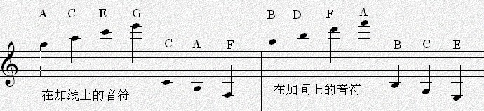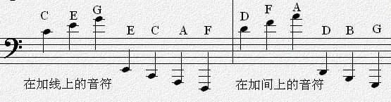 F谱号四线上是F音(fa),那么三间上是E音(mi)、四间上是G音(sol),五线上是是A音(la)、上加一间是B音(si)、上加一线是C音(do),以此类推便可以确定F谱表上所有位置的音高。