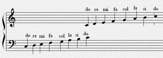 由于谱号的不同,唱名在各谱表中也就不同。高音谱表的do在下加一线,低音谱表的do在上加一线。