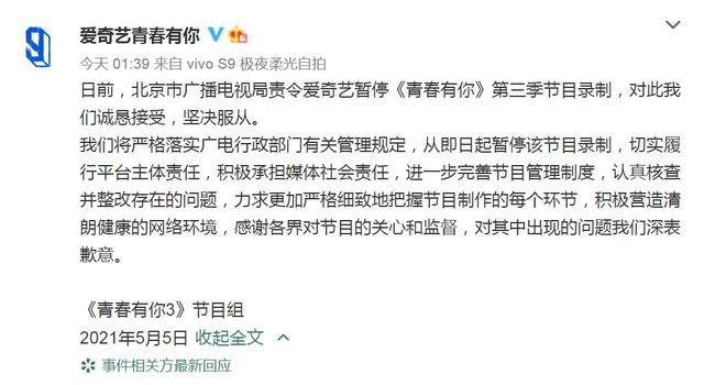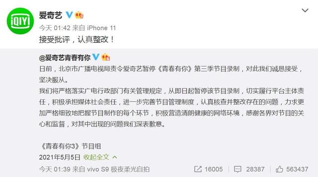 5月5日,@爱奇艺青春有你就“《青春有你》第三季节目录制被责令暂停”一事回应称,接受批评,认真整改!