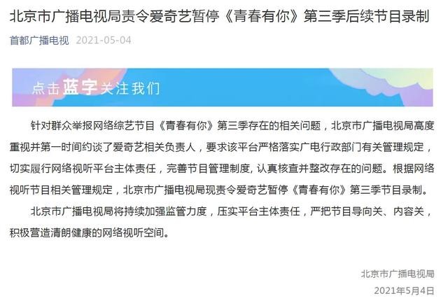 5月4日,北京市广播电视局发布的通报指出,责令爱奇艺暂停《青春有你》第三季后续节目录制。