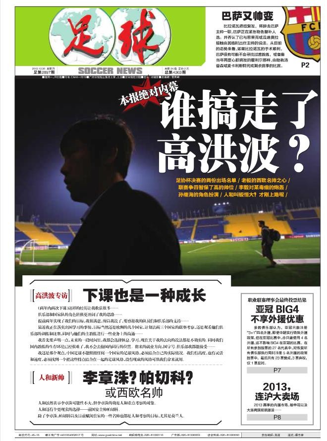 2012年《足球》报,还有了电子版。随着网络已普及和发达,有电脑必有网。各大体育网站已可包罗天下足球,《足球》报淡淡淡出视野。如今,一部智能手机便知晓天下事,很多报纸早已停刊。《足球》报还在................我拿起手机,悄悄关注了《足球》报。