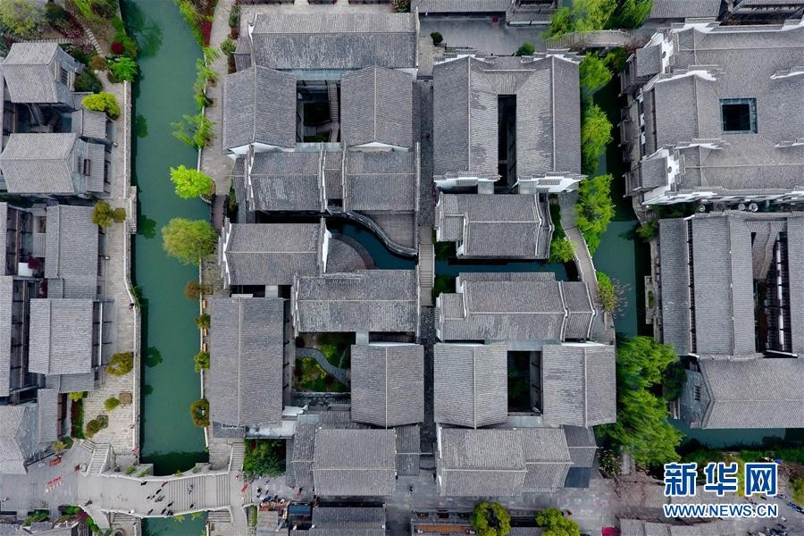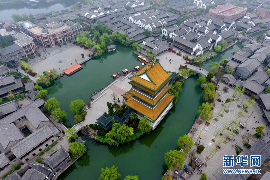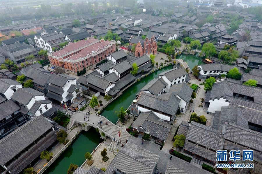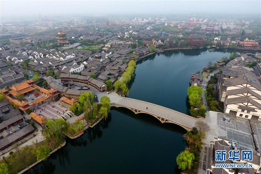 4月7日航拍的台儿庄古城。山东省枣庄市台儿庄古城位于京杭大运河沿岸,是明清时期有名的“水旱码头、商贸重镇”,一度“商贾迤逦,一河渔火,歌声十里,夜不罢市”,但是于1938年毁于日军炮火。
