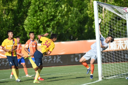 6月17日,陕西长安竞技队球员逄志泉(右二)在比赛中头球射门得分。 新华社发(史康摄)