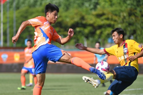 6月17日,江西北大门队球员康振捷(左)在比赛中与陕西长安竞技队球员杨鹏拼抢。 新华社发(史康摄)