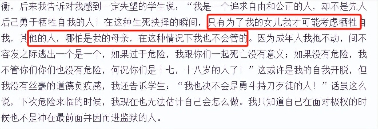 “只有为了我的女儿我才可能考虑牺牲自我,其他的人,哪怕是我母亲,这种情况下我也不会管的!”