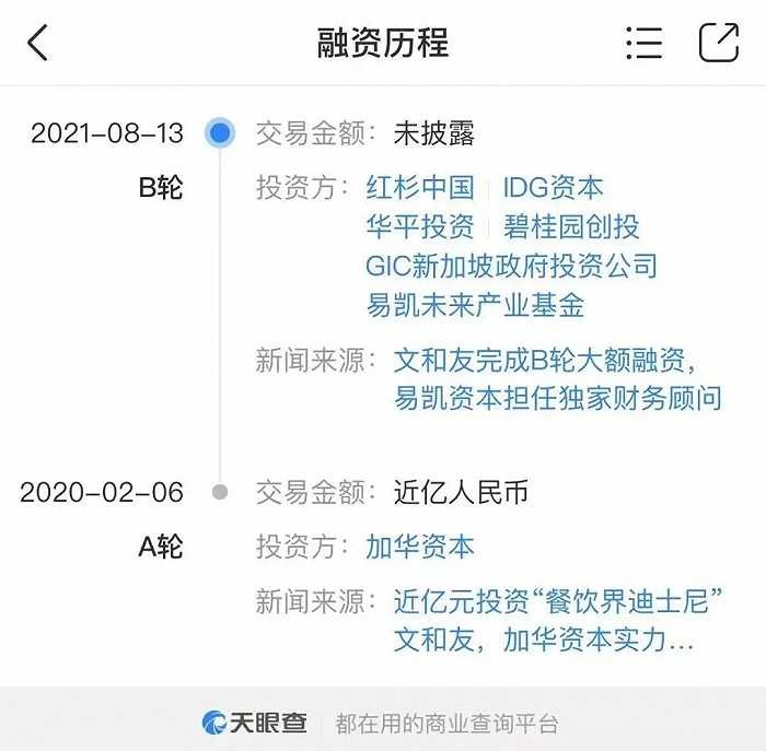 2021年8月15日,文和友小龙虾有限公司落地了B轮融资,估值或超过100亿。据了解,本轮融资由IDG资本领投,其他投资方为红杉中国、华平投资、碧桂园创投、GIC、易凯基金等。