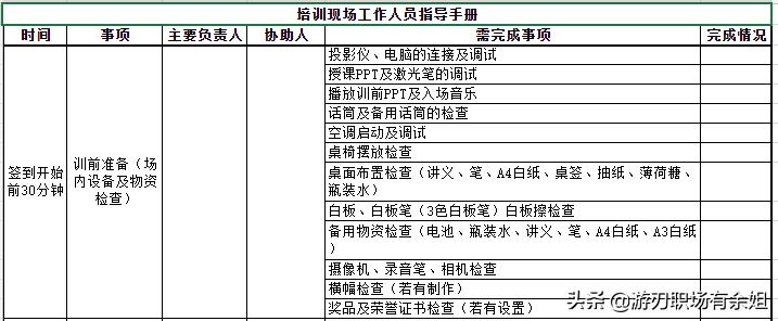 当然,这只是其中很小一部分的截图,具体说明了在组织一个线下培训时,在通知学员签到时间的前30分钟,现场培训工作人员应该做一些什么事情。